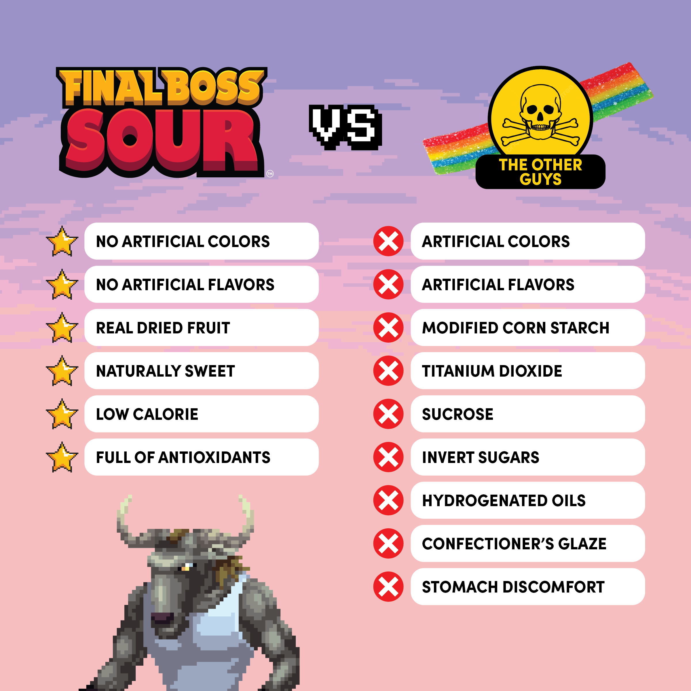 We take real dried strawberries and give them a gentle blast of our Level 1 sour blend 💥 — just enough tartness to spark your curiosity without stealing the spotlight. Soft, chewy, and subtly sour, it’s the perfect intro to the Final Boss Sour universe 👅✨
