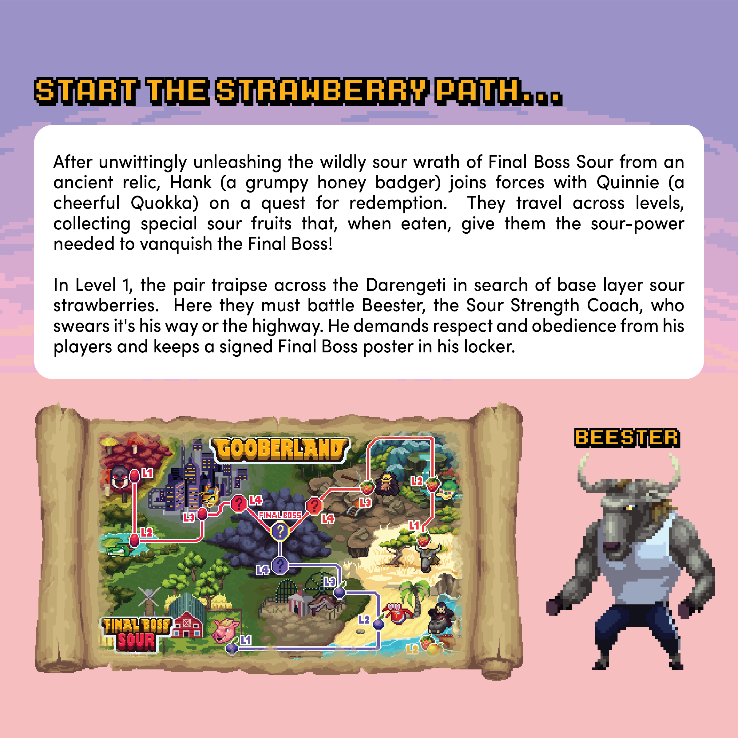 In Level 1, the pair traipse across the Darengeti in search of base layer sour strawberries. Here they must battle Beester, the Sour Strength Coach, who swears it's his way or the highway. He demands respect and obedience from his players and keeps a signed Final Boss poster in his locker.